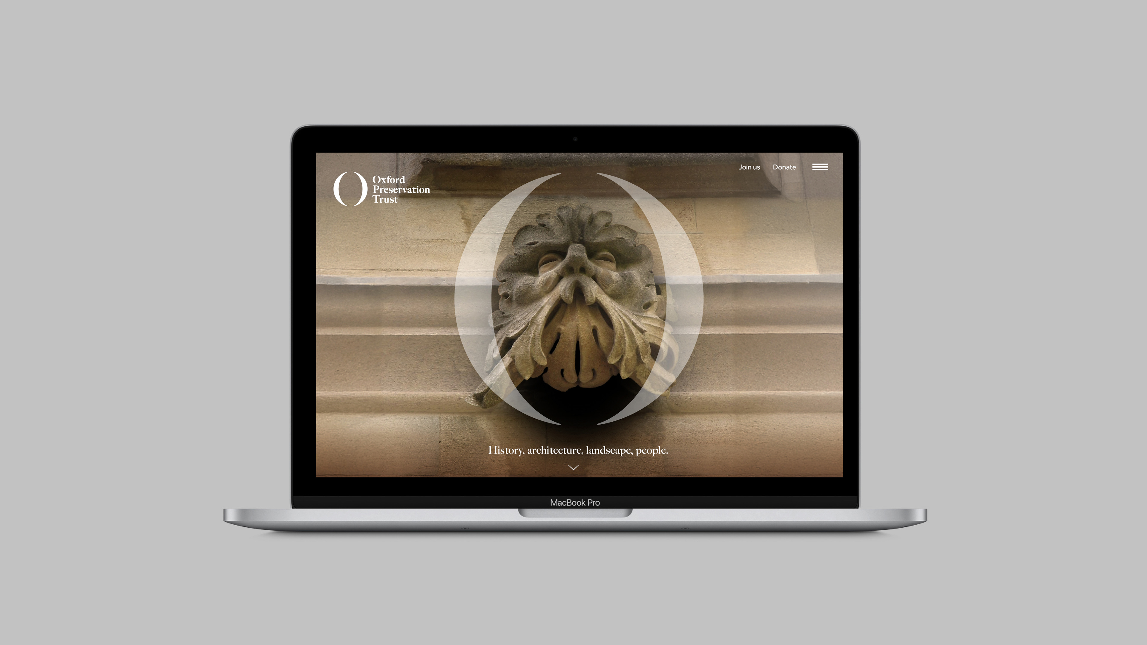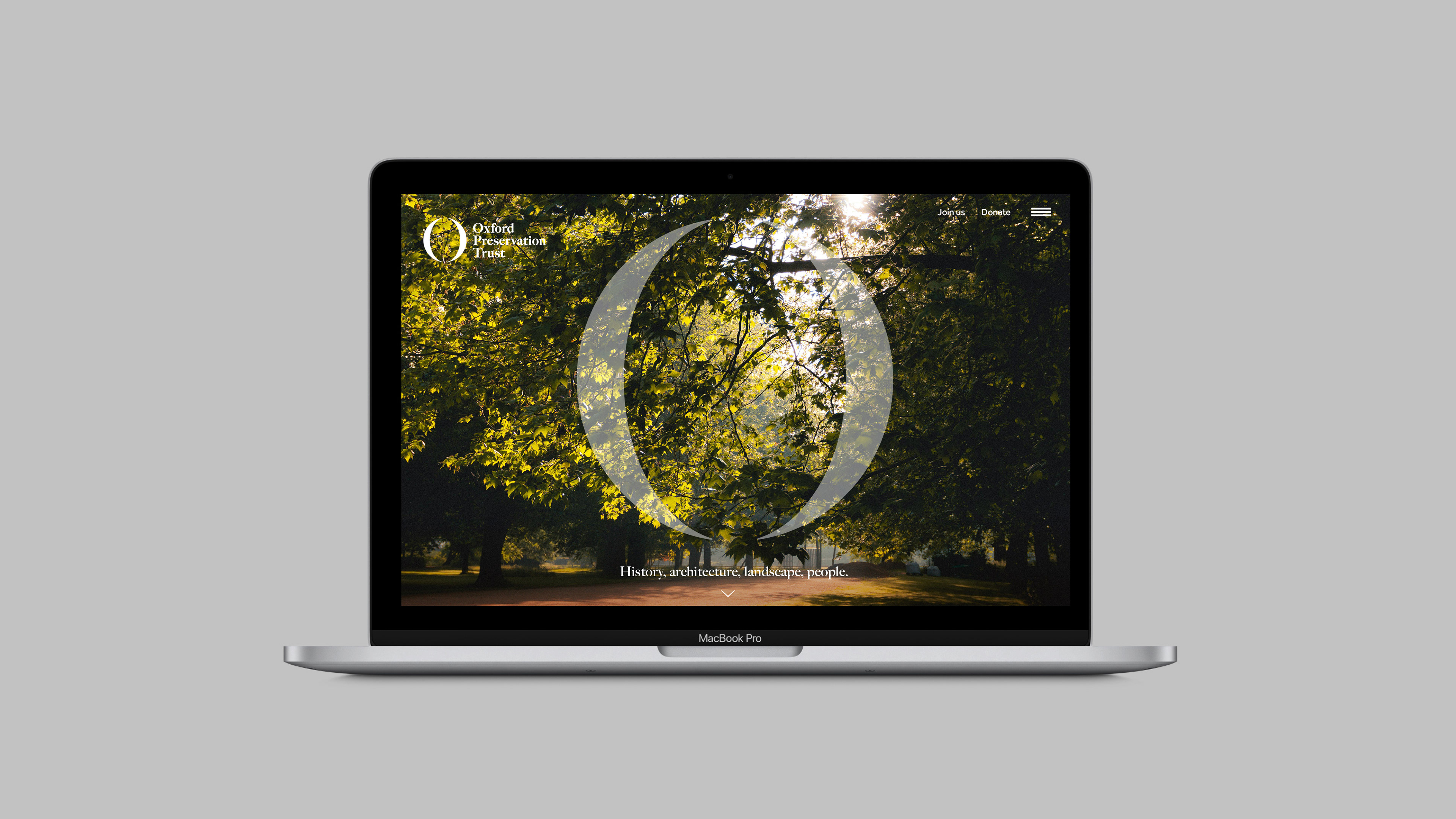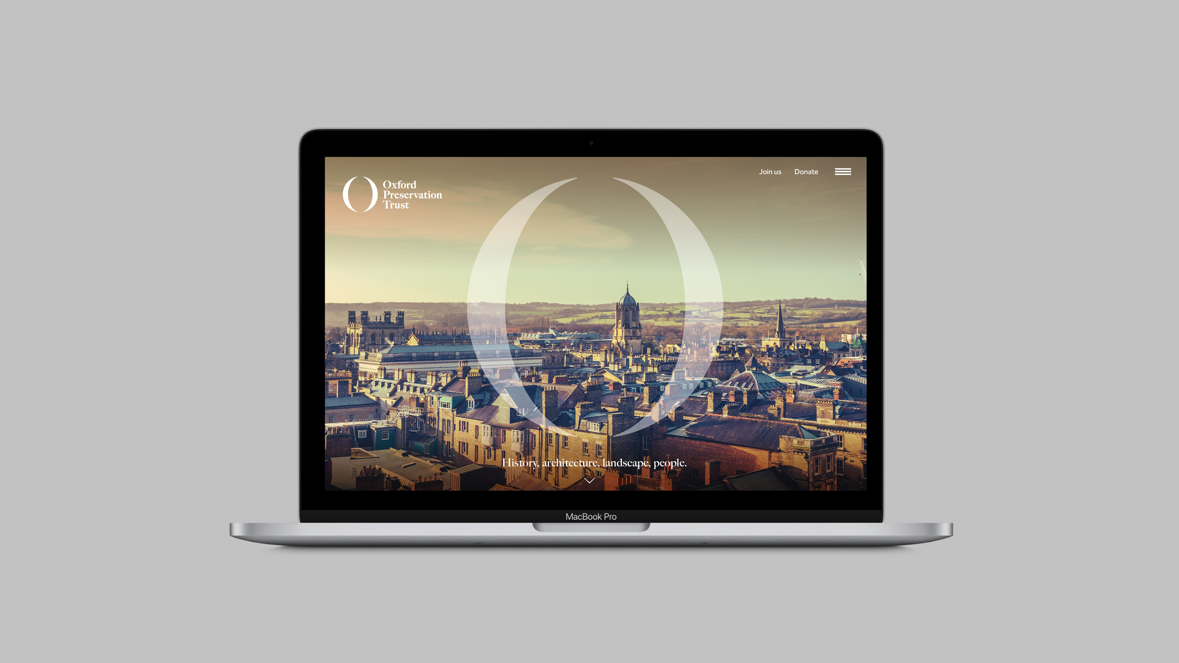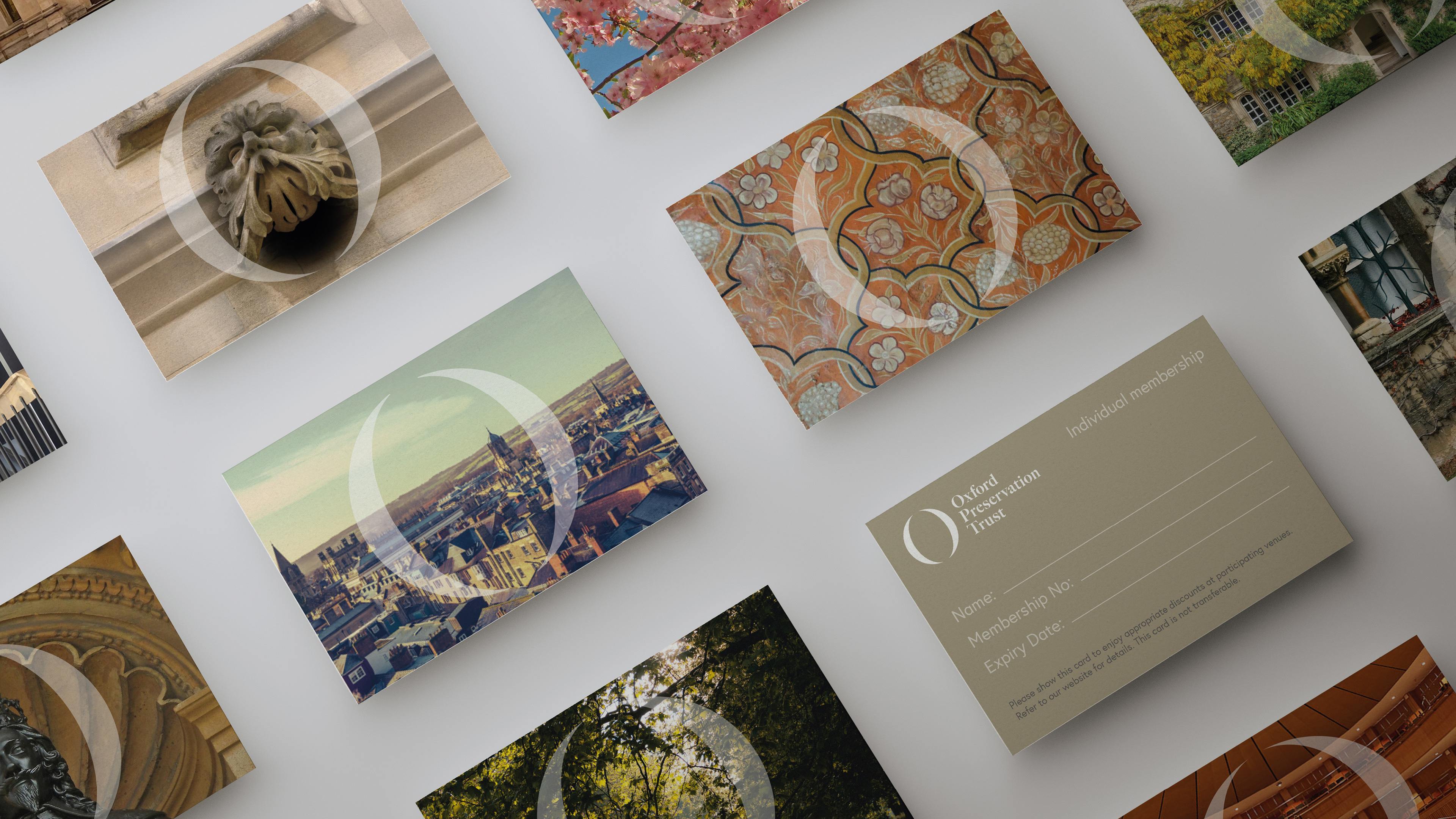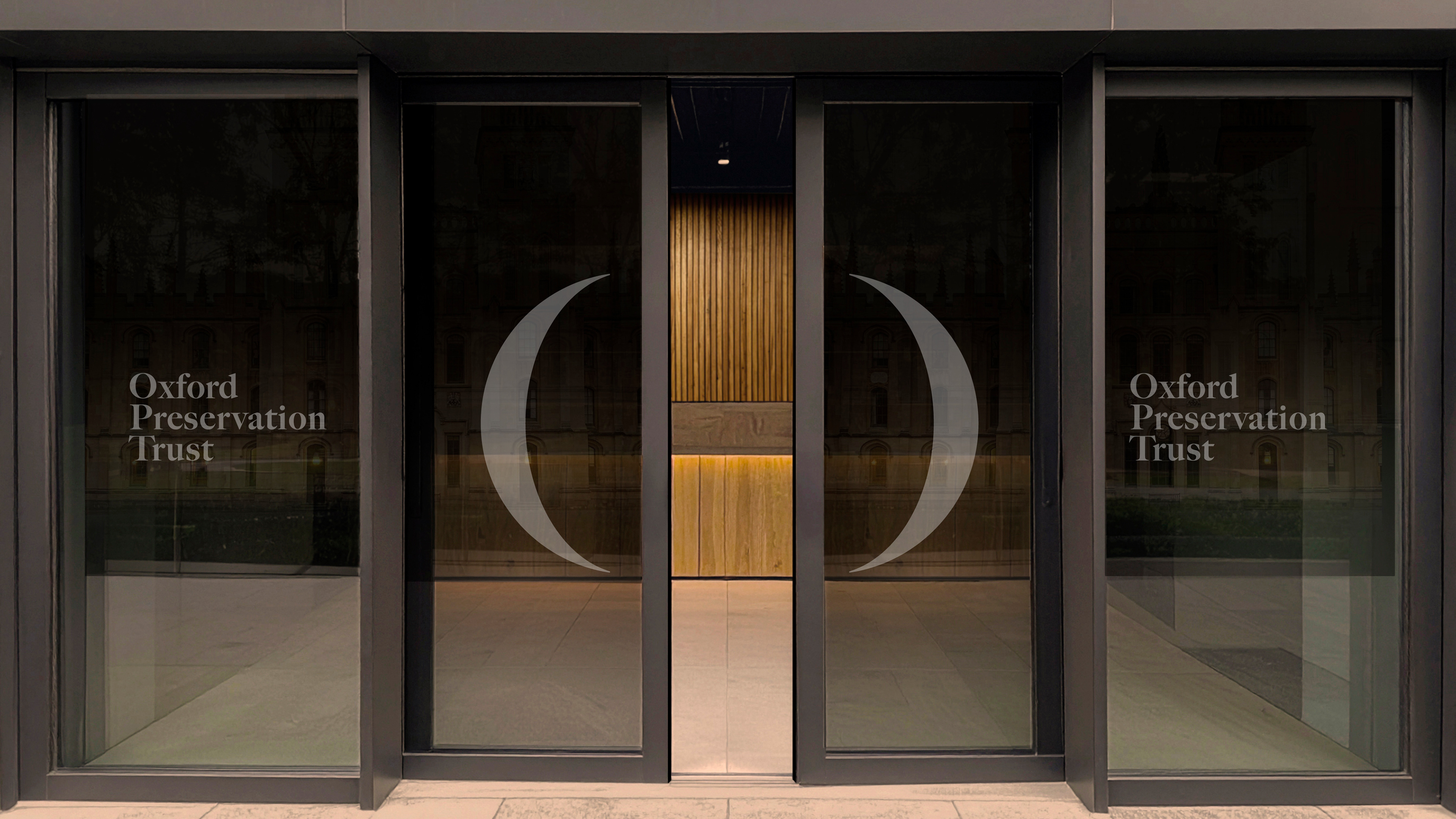 The new logo is based on a serif ‘O’ to represent Oxford Preservation Trust. The thicks and thins of the letter form are exaggerated to the point where they create typographic parentheses (rounded brackets). This graphic device is combined with photography of the city and places under the care of the trust – suggesting focus, protection and care for different aspects of the city and the trust’s works. The device also frames a diverse range of people to promote inclusivity.