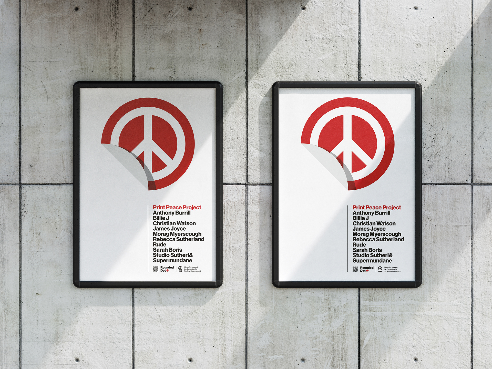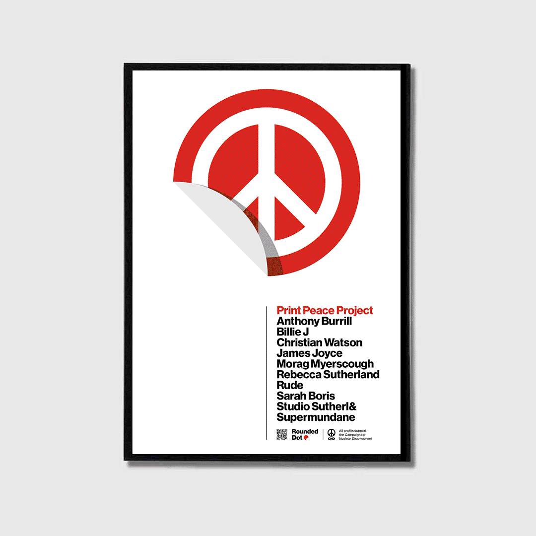 The Print Peace Project brought ten leading artists together to lend their creativity and support. The artists included Anthony Burrill, Billie J, Christian Watson, James Joyce, Morag Myerscough, Rebecca Sutherland, Rude, Sarah Boris, Studio Sutherl& and Supermundane.